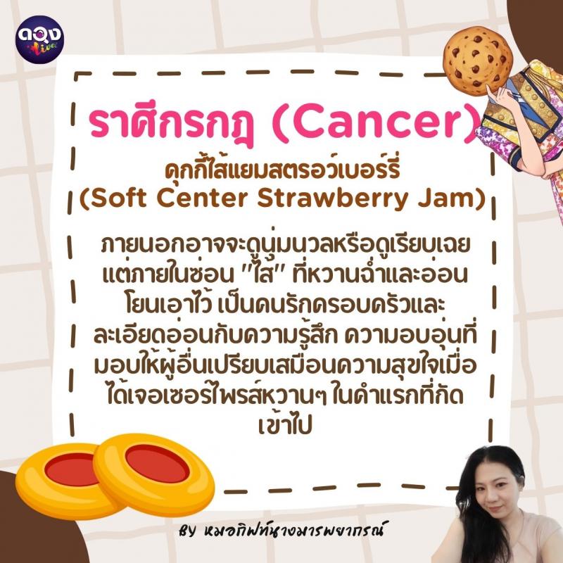 ♋️ ราศีกรกฎ (Cancer): คุกกี้ไส้แยมสตรอว์เบอร์รี (Soft Center Strawberry Jam) ภายนอกอาจจะดูนุ่มนวลหรือดูเรียบเฉย แต่ภายในซ่อน "ไส้" ที่หวานฉ่ำและอ่อนโยนเอาไว้ เป็นคนรักครอบครัวและละเอียดอ่อนกับความรู้สึก ความอบอุ่นที่มอบให้ผู้อื่นเปรียบเสมือนความสุขใจเมื่อได้เจอเซอร์ไพรส์หวานๆ ในคำแรกที่กัดเข้าไป