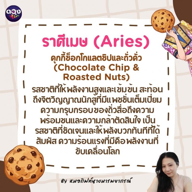 ♈️ ราศีเมษ (Aries): คุกกี้ช็อกโกแลตชิปและถั่วคั่ว (Chocolate Chip & Roasted Nuts) รสชาติที่ให้พลังงานสูงและเข้มข้น สะท้อนถึงจิตวิญญาณนักสู้ที่มีแพชชันเต็มเปี่ยม ความกรุบกรอบของถั่วสื่อถึงความพร้อมชนและความกล้าตัดสินใจ เป็นรสชาติที่ชัดเจนและให้พลังบวกทันทีที่ได้สัมผัส ความร้อนแรงที่มีคือพลังงานที่ขับเคลื่อนโลก