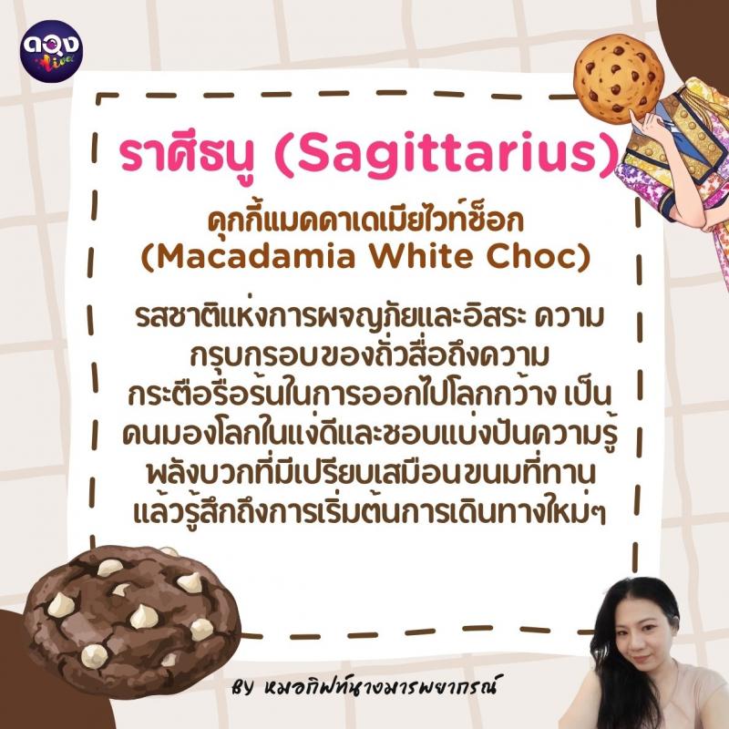 ♐️ ราศีธนู (Sagittarius): คุกกี้แมคคาเดเมียไวท์ช็อก (Macadamia White Choc) รสชาติแห่งการผจญภัยและอิสระ ความกรุบกรอบของถั่วสื่อถึงความกระตือรือร้นในการออกไปโลกกว้าง เป็นคนมองโลกในแง่ดีและชอบแบ่งปันความรู้ พลังบวกที่มีเปรียบเสมือนขนมที่ทานแล้วรู้สึกถึงการเริ่มต้นการเดินทางใหม่ๆ