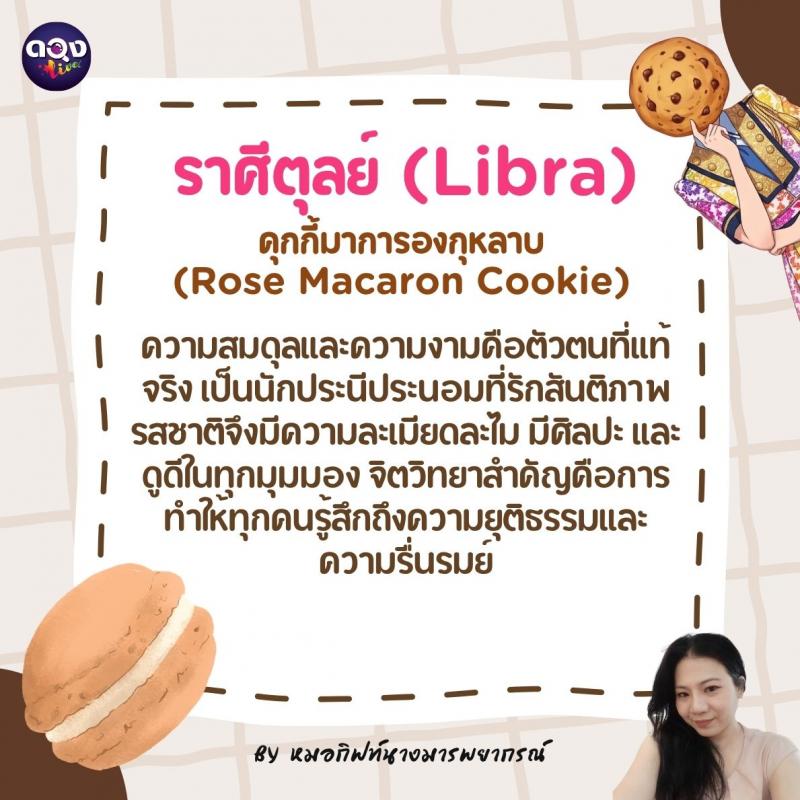 ♎️ ราศีตุลย์ (Libra): คุกกี้มาการองกุหลาบ (Rose Macaron Cookie) ความสมดุลและความงามคือตัวตนที่แท้จริง เป็นนักประนีประนอมที่รักสันติภาพ รสชาติจึงมีความละเมียดละไม มีศิลปะ และดูดีในทุกมุมมอง จิตวิทยาสำคัญคือการทำให้ทุกคนรู้สึกถึงความยุติธรรมและความรื่นรมย์