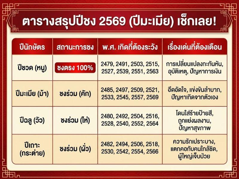 ตารางสรุปปีชง 2569เช็กเลย! ปีนักษัตรโดนผลกระทบเรื่องไหน?