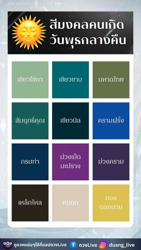 สีมงคลที่เหมาะกับคนเกิดวันพุธกลางคืน สีมงคลของคนวันนี้ควรช่วยส่งเสริมความลุ่มลึก เสน่ห์ที่พูดน้อยแต่มีแรงดึงดูด และเพิ่มพลังงานให้ไม่จมกับความรู้สึกมากเกินไป เพราะพื้นดวงมีแนวโน้มคิดวน คิดซ้ำจนเหนื่อยเองได้ง่ายคือสีดังนี้