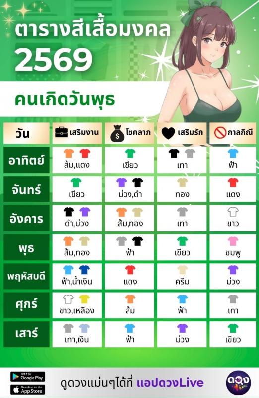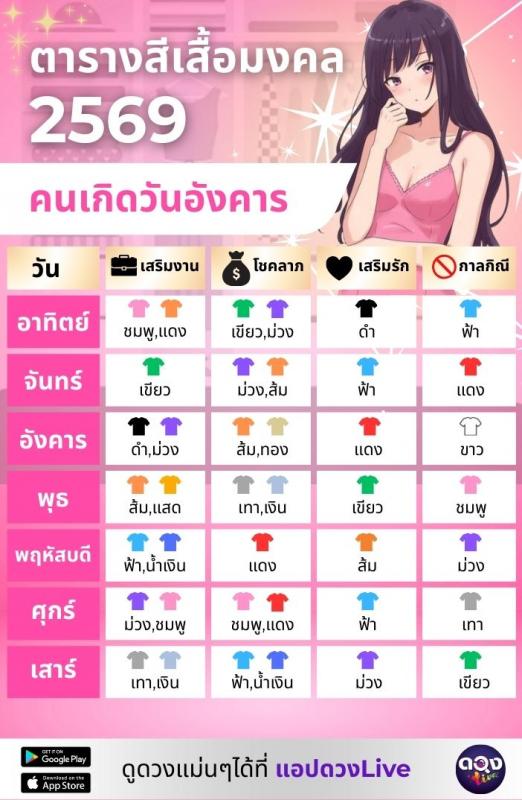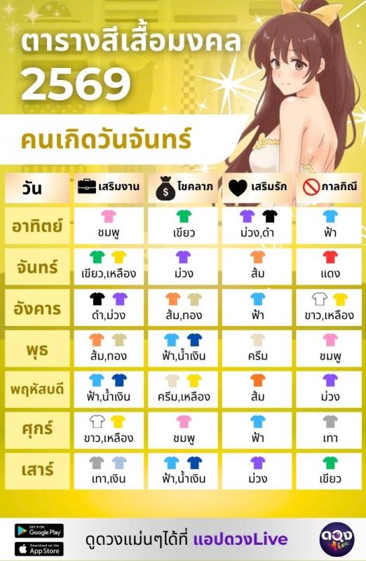 อัปเดตล่าสุด! ตารางสีเสื้อมงคล 2569 แต่ละวันเกิด ใส่สีไหนแล้วรวย งานรุ่ง รักปัง เช็กเลย!