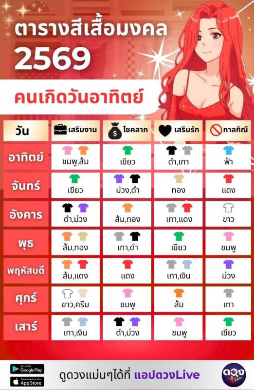 ตารางสีเสื้อมงคลคนเกิดวันอาทิตย์