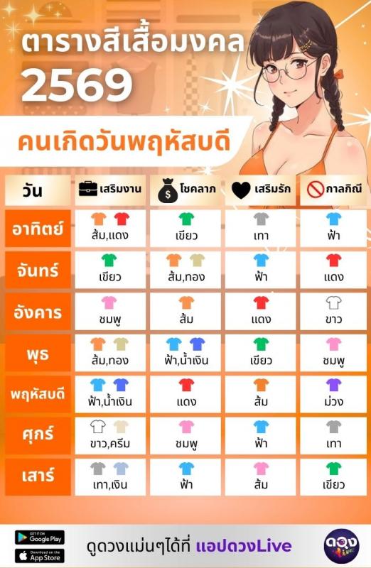 ตารางสีเสื้อมงคลคนเกิดวันพฤหัสบดี
