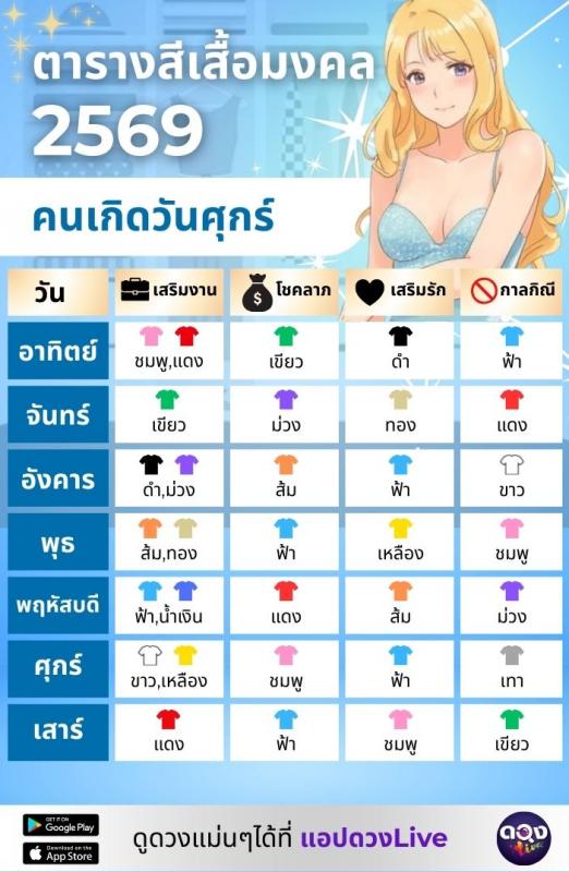 ตารางสีเสื้อมงคลคนเกิดวันศุกร์
