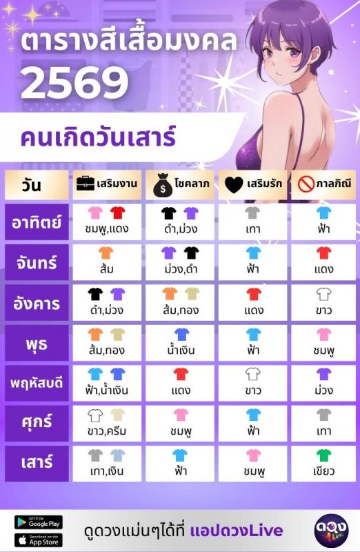 ตารางสีเสื้อมงคลคนเกิดวันเสาร์