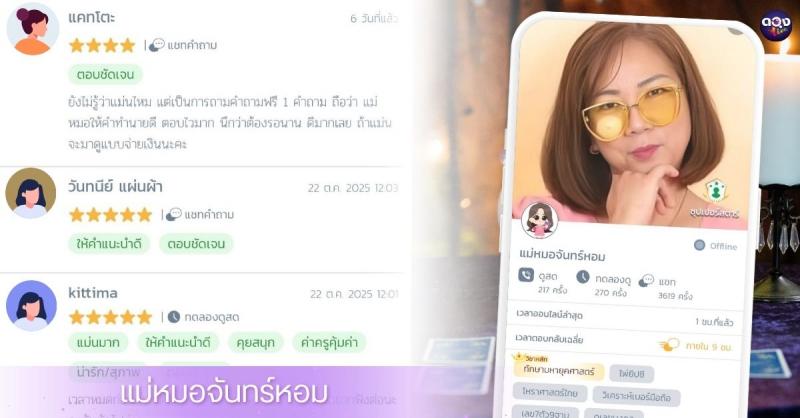 แม่หมอจันทร์หอม หมอดูใจดีที่ใครได้คุยด้วยจะรู้สึกสบายใจสุดๆ เชื่อในพลังบุญและการอโหสิกรรม ใช้ไพ่ Guanyindi Tarot คู่กับโหราศาสตร์และเลข 7 ตัว ดูลึกแบบเฉพาะบุคคลจากวัน เดือน ปี และเวลาเกิด บอกเลยว่าแม่น ละเอียด และให้พลังบวกมากค่ะ ไม่รับดูเรื่องความรักหรือคู่ครองสำหรับผู้ที่อายุต่ำกว่า 18 ปีนะคะ