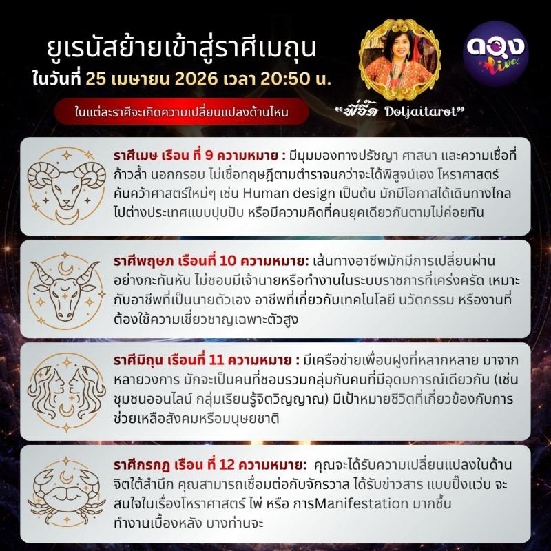 ดาวย้ายราศียูเรนัสย้ายเข้าสู่ราศีเมถุน ในวันที่ 25 เมษายน 2026 เวลา 20:50 น.ในแต่ละราศีจะเกิดความเปลี่ยนแปลงด้านไหน ทำนายโดย พี่อี๊ด Doljaitarot