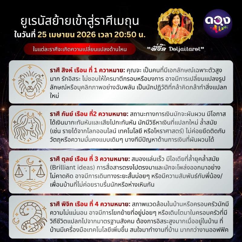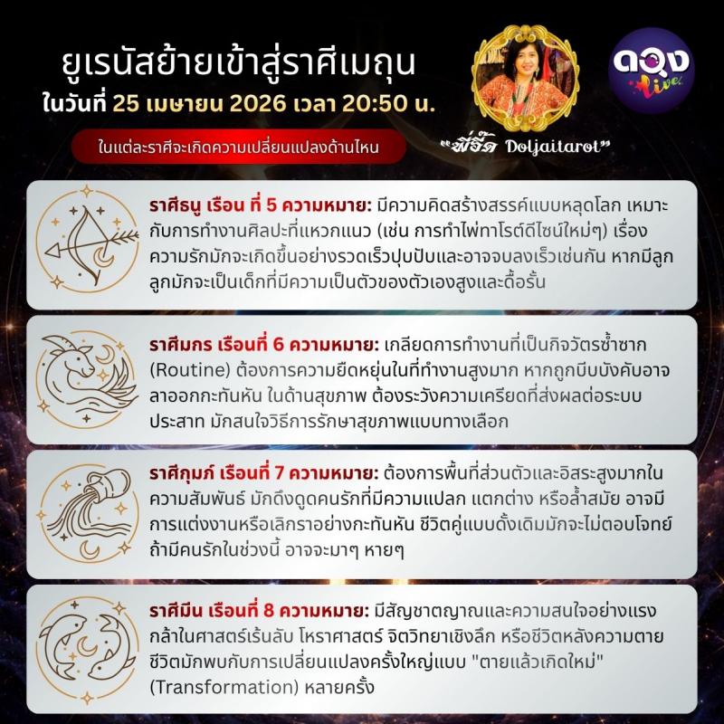 #ดาวย้ายราศียูเรนัสย้ายเข้าสู่ราศีเมถุน (Uranus in Gemini) ในวันที่ 25 เมษายน 2026 เวลา 20:50 น. (EST) ถือเป็นการเปลี่ยนผ่านครั้งสำคัญอย่างถาวรของดาวแห่งนวัตกรรมเข้าสู่ราศีมิถุน ซึ่งเป็นราศีแห่งการสื่อสาร การศึกษา ” ซึ่งจะอยู่ยาวไปจนถึงปี 2032–2033