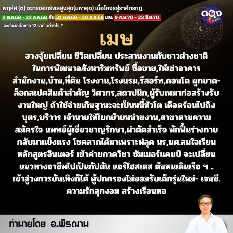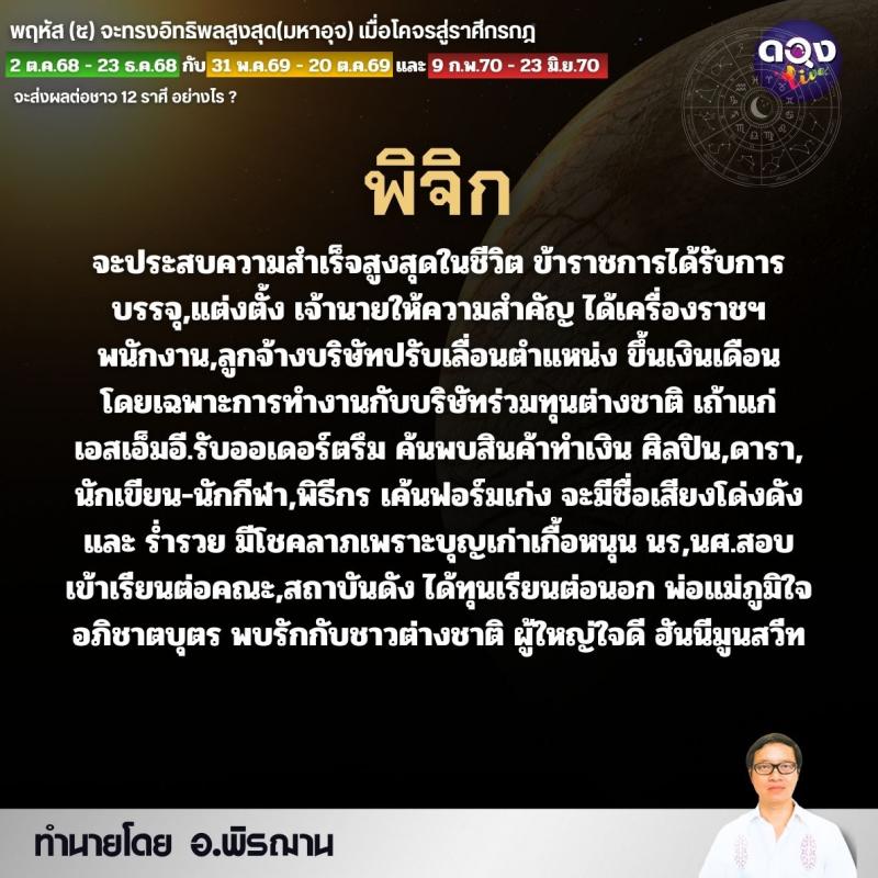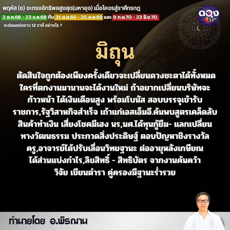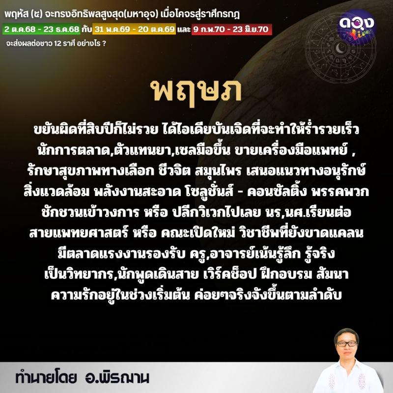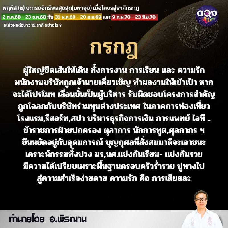 พฤหัส (๕) จะทรงอิทธิพลสูงสุด (มหาอุจ) เมื่อโคจรสู่ราศีกรกฎ 2 ต.ค. 68 - 23 ธ.ค. 68 กับ 31 พ.ค. 69 - 20 ต.ค. 69 และ 9 ก.พ. 70 - 23 มิ.ย. 70 .. จะส่งผลต่อชาว 12 ราศี อย่างไร ? โดยอ.พิรฌาน