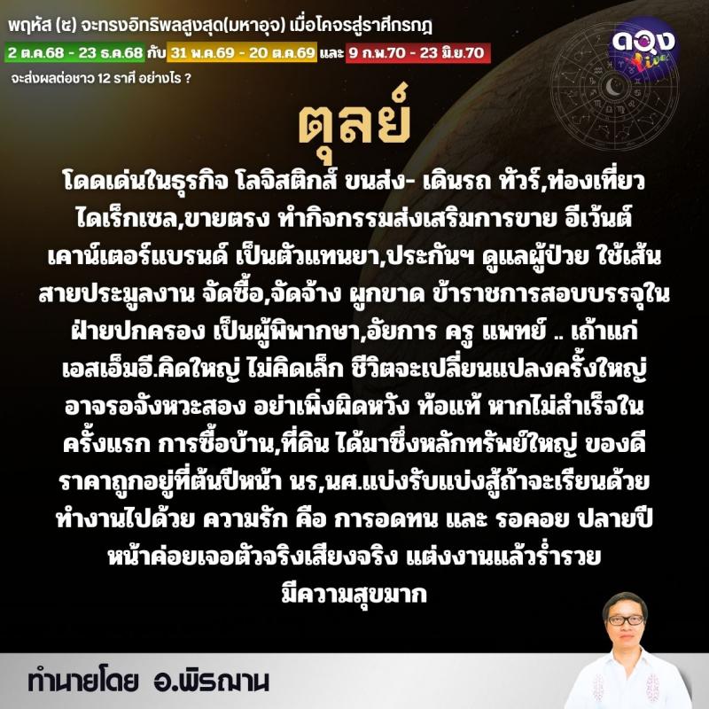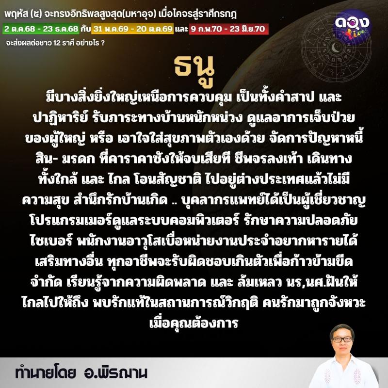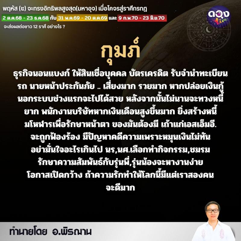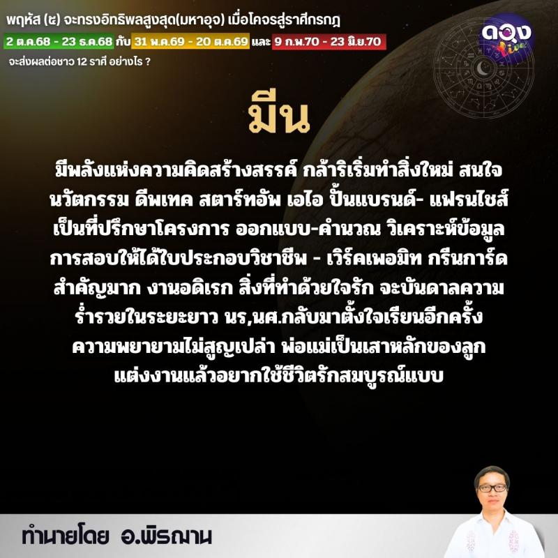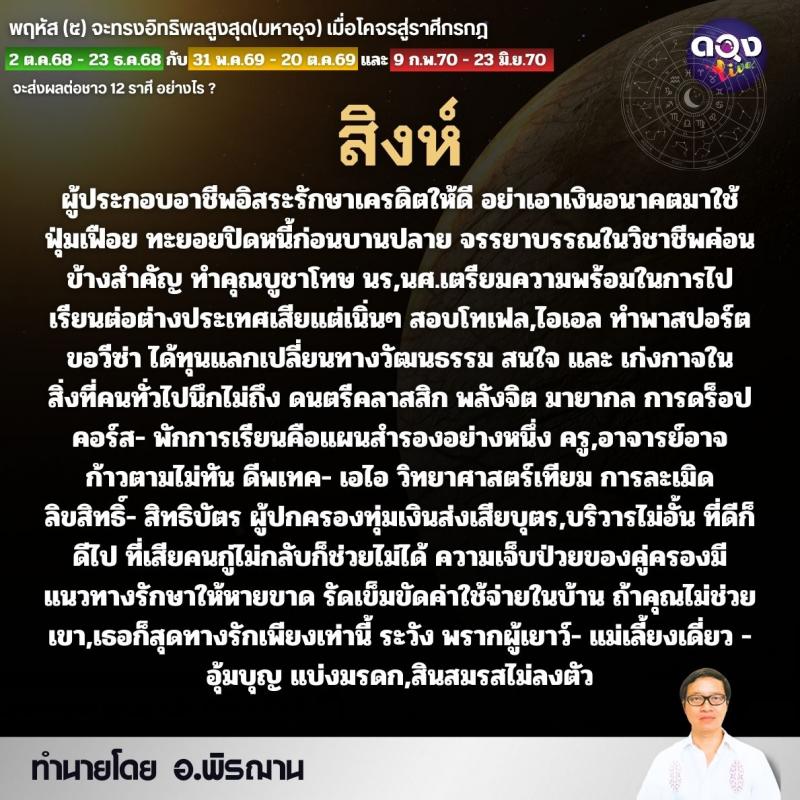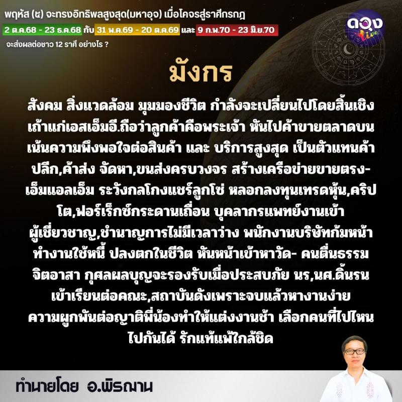 พฤหัส (๕) จะทรงอิทธิพลสูงสุด (มหาอุจ) เมื่อโคจรสู่ราศีกรกฎ 2 ต.ค. 68 - 23 ธ.ค. 68 กับ 31 พ.ค. 69 - 20 ต.ค. 69 และ 9 ก.พ. 70 - 23 มิ.ย. 70 .. จะส่งผลต่อชาว 12 ราศี อย่างไร ? โดยอ.พิรฌาน