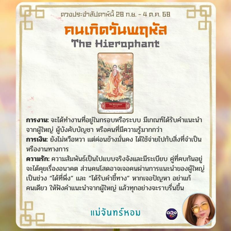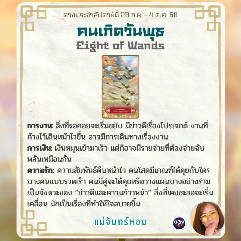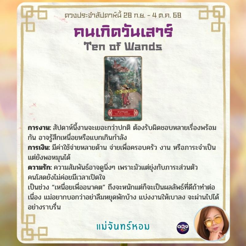 การงาน: สัปดาห์นี้งานจะเยอะกว่าปกติ ต้องรับผิดชอบหลายเรื่องพร้อมกัน อาจรู้สึกเหนื่อยหรือแบกเกินกำลัง