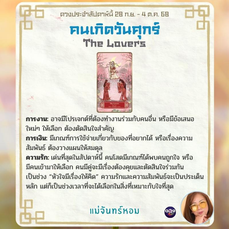 การงาน: อาจมีโปรเจกต์ที่ต้องทำงานร่วมกับคนอื่น หรือมีข้อเสนอใหม่ๆ ให้เลือก ต้องตัดสินใจสำคัญ