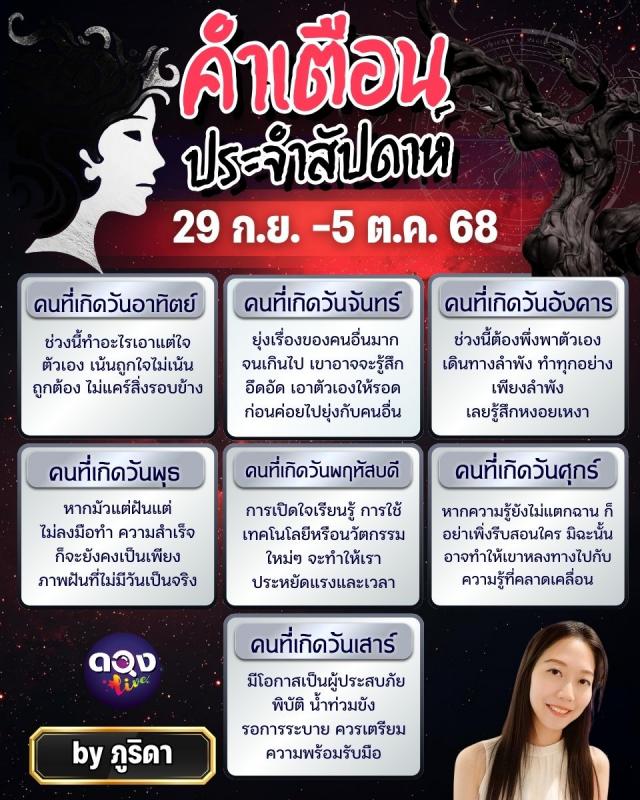 คำเตือนประจำสัปดาห์ 29 ก.ย.-5 ต.ค. 68 ทำนายโดย ภูริดา