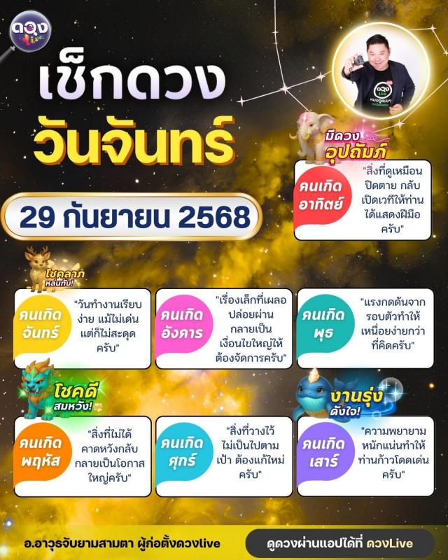 ดวงรายวันจันทร์ที่ 29 กันยายน 2568 โดย อ.อาวุธจับยามสามตา – ผู้ก่อตั้งดวงLive