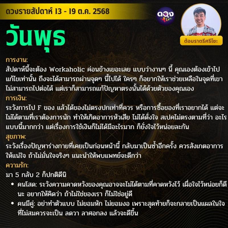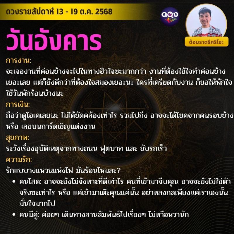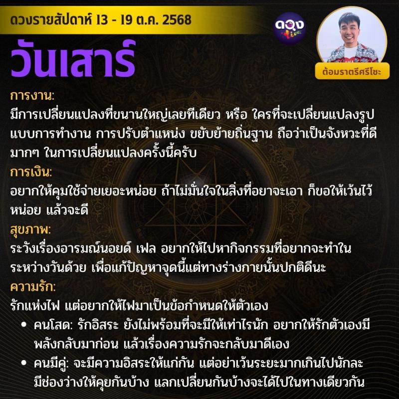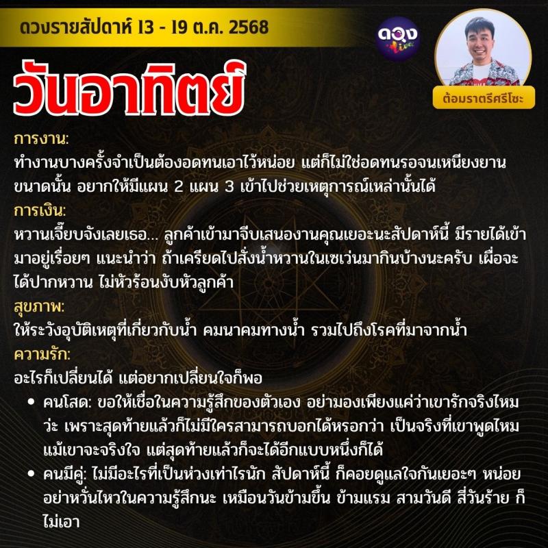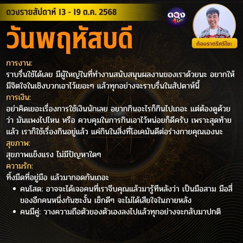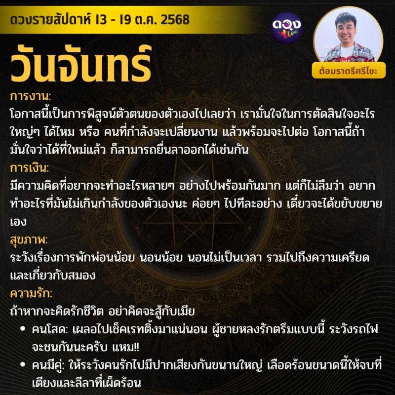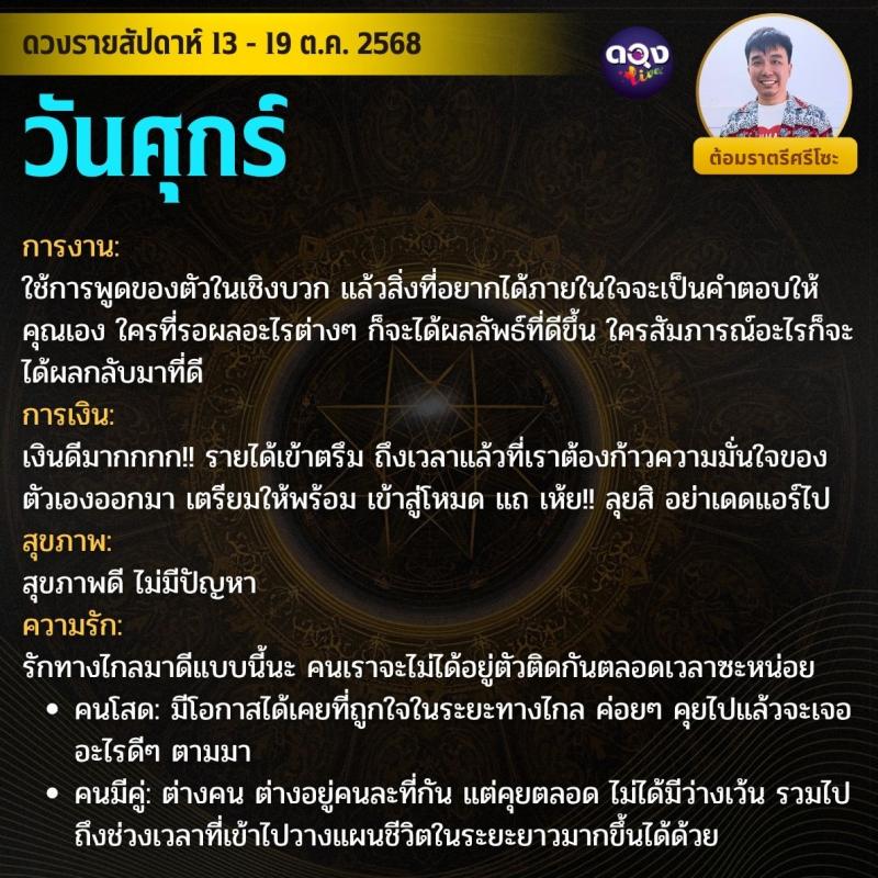 ดวงรายสัปดาห์ 13 – 19 ตุลาคม 2568 By ต้อมราตรีศรีโซะ