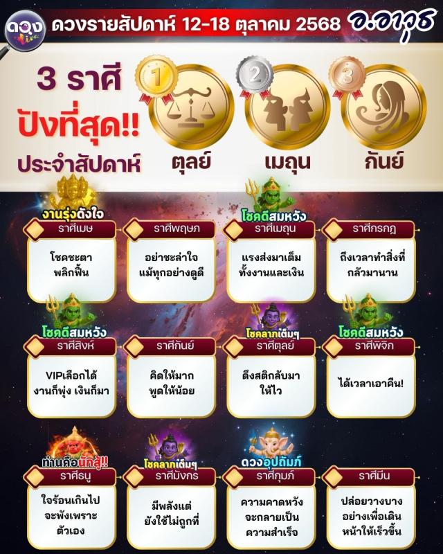 ดวงรายสัปดาห์ ประจำวันที่ 12–18 ตุลาคม 2568 โดย อ.อาวุธจับยามสามตา – ผู้ก่อตั้งดวงLive