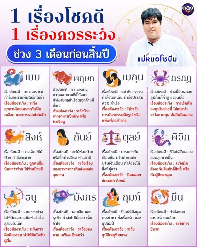 1 เรื่องโชคดี / 1 เรื่องควรระวัง ช่วง 3 เดือนสุดท้ายก่อนสิ้นปี โดย แม่หมอโซบีม