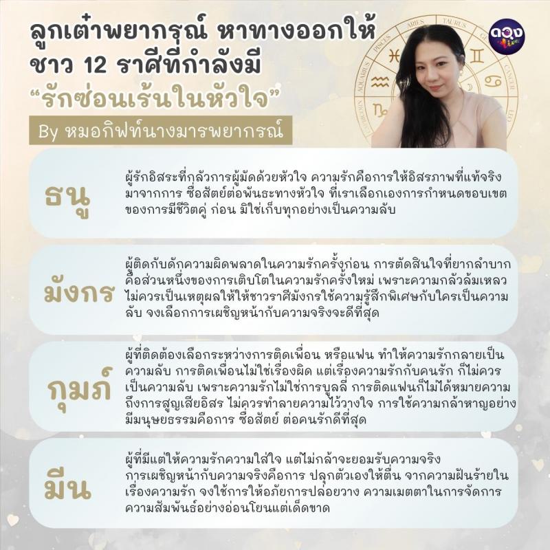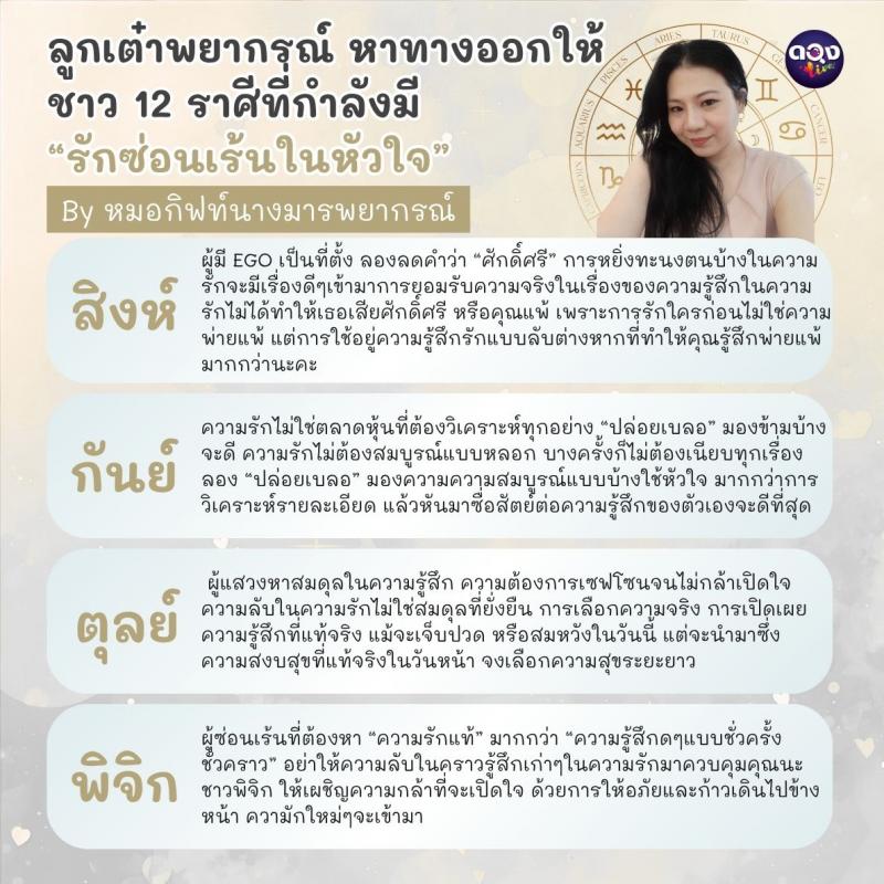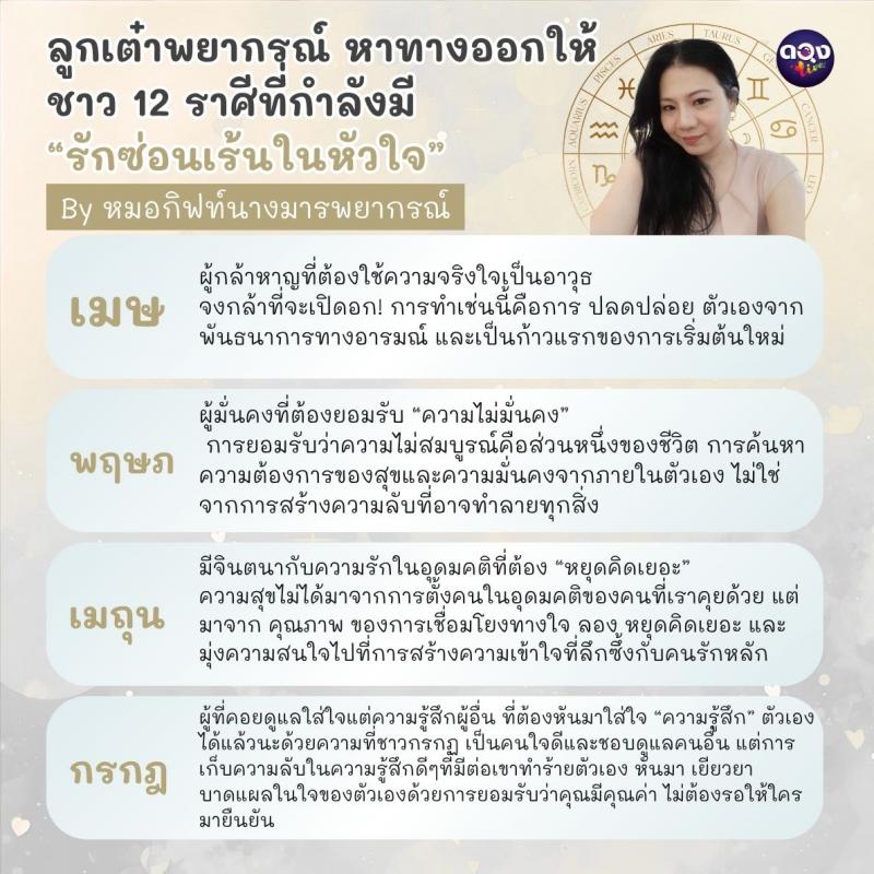 ยิ่งฉันใกล้เธอเท่าไหร่ ไม่อาจจะเผยใจ ยิ่งสบสายตาก็ยิ่งหวั่นไหว นั่นคือ ความลับในความรู้สึกที่ถูกซ่อนเอาไว้ เข้าใจดีว่าความรู้สึกสับสนในความสัมพันธ์นั้นทรมานใจเพียงใด โดยเฉพาะอย่างยิ่งเมื่อหัวใจกำลังมี “รักซ่อนเร้น” ความลับนี้เป็นเหมือนเงาที่ตามติด ซึ่งความรักที่ซ่อนเร้นนี้ ไม่ใช่การเป็นโลกใบที่สองของใครนะ แต่มันคือ ความรักที่ไม่กล้าบอกเขาว่าเรารู้สึกกับเขาอย่างไร ทำให้เราไม่สามารถมีความสุขได้อย่างเต็มที่ วันนี้ พี่หมอกิฟท์นางมารพยากรณ์ ใช้ศาสตร์การทำนายลูกเต๋าพยากรณ์” หรือ Astragalomancy เพื่อค้นหา “รากปัญหา” ของรักซ่อนเร้นในชาว 12 ราศี พร้อมมอบ กำลังใจ (Positive Mind) ให้เธอ คนเก่ง ก้าวผ่านไปได้อย่างเข้มแข็งที่สุดค่ะ เมื่อพร้อมแล้วมาดูคำทำนายกัน