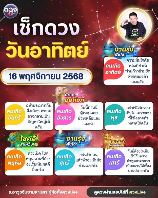 ดวงรายวันประจำวันอาทิตย์ที่ 16 พฤศจิกายน 2568 โดย อ.อาวุธจับยามสามตา – ผู้ก่อตั้งดวง Live