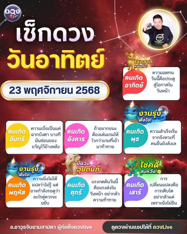 ดวงรายวันประจำวันอาทิตย์ที่ 23 พฤศจิกายน 2568 โดย อ.อาวุธจับยามสามตา – ผู้ก่อตั้งดวง Live