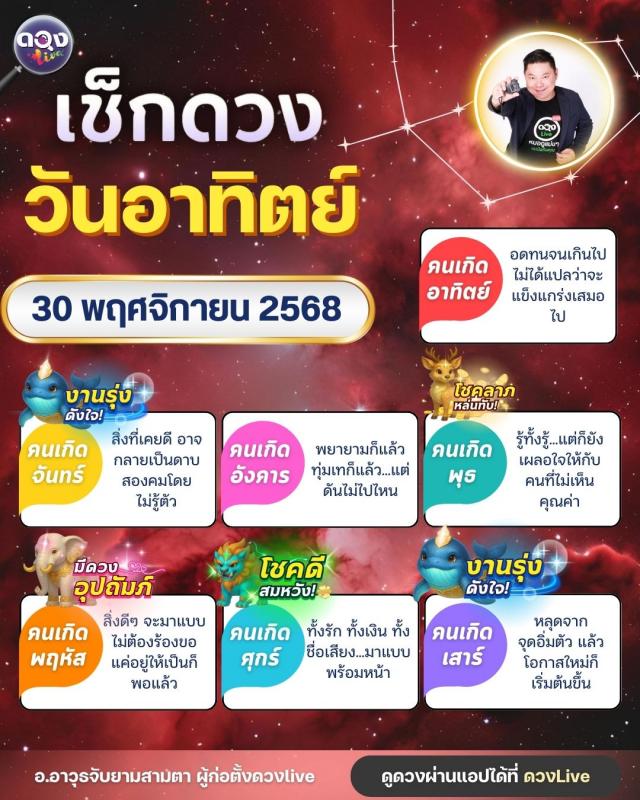 ดวงรายวันประจำวันอาทิตย์ที่ 30 พฤศจิกายน 2568 โดย อ.อาวุธจับยามสามตา – ผู้ก่อตั้งดวง Live