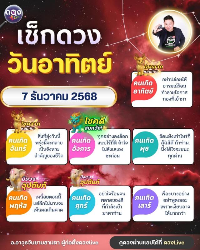 ดวงรายวันประจำวันอาทิตย์ที่ 7 ธันวาคม 2568 โดย อ.อาวุธจับยามสามตา – ผู้ก่อตั้งดวง Live
