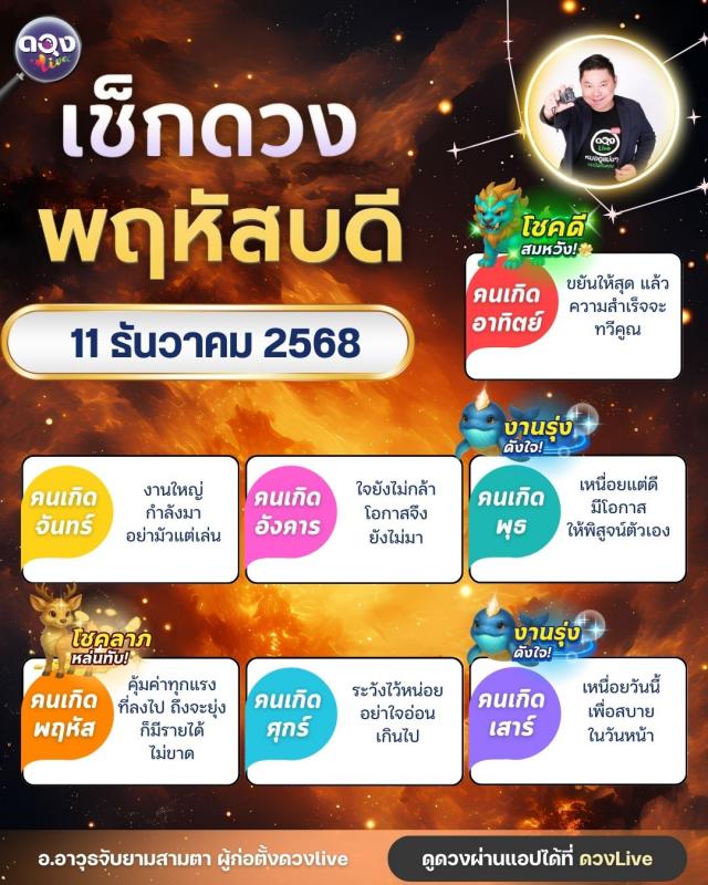 ดวงรายวันประจำวันพฤหัสบดีที่ 11 ธันวาคม 2568 โดย อ.อาวุธจับยามสามตา – ผู้ก่อตั้งดวง Live