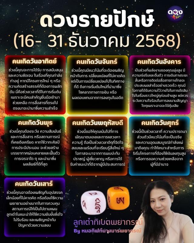 ลูกเต๋าทิเบตพยากรณ์ ดวงรายปักษ์ 16 – 31 ธันวาคม 2568 โดย หมอกิฟท์ นางมารพยากรณ์