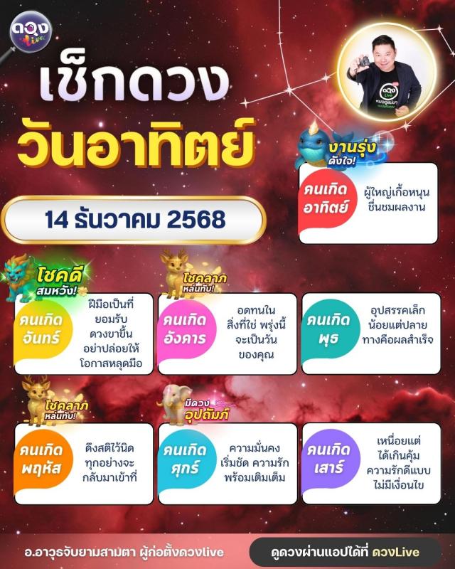 ดวงรายวันประจำวันอาทิตย์ที่ 14 ธันวาคม 2568 โดย อ.อาวุธจับยามสามตา – ผู้ก่อตั้งดวง Live