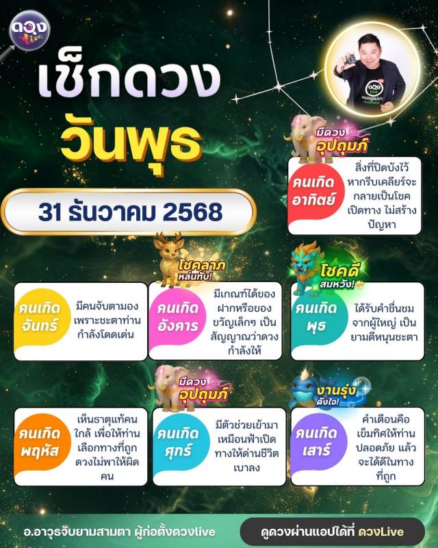 ดวงรายวันประจำวันพุธที่ 31 ธันวาคม 2568 โดย อ.อาวุธจับยามสามตา – ผู้ก่อตั้งดวง Live
