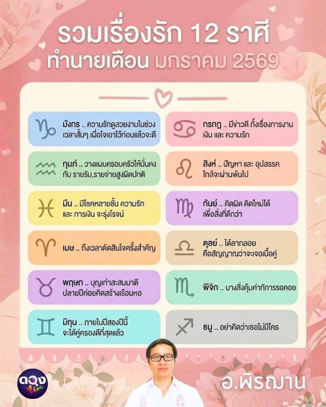รวมเรื่องรัก 12 ราศี ทำนายเดือนมกราคม 2569 โดย อาจารย์พิรฌาน