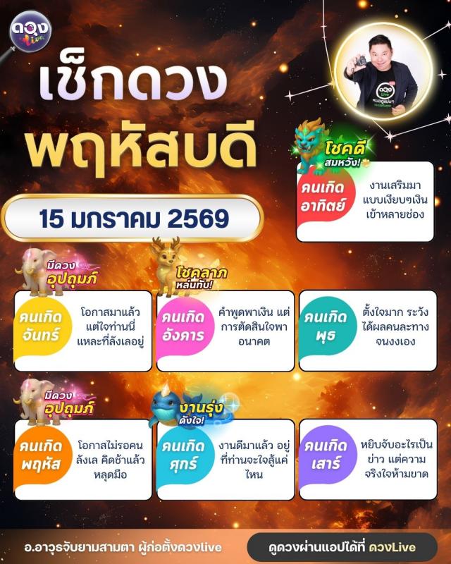 ดวงรายวันประจำวันพฤหัสบดีที่ 15 มกราคม 2569 โดย อ.อาวุธจับยามสามตา – ผู้ก่อตั้งดวง Live