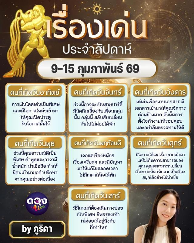 เรื่องเด่นประเด็นเด็ดประจำสัปดาห์ 9-15 ก.พ. 69 ทำนายโดย ภูริดา