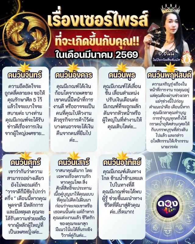เรื่องเซอร์ไพรส์ที่จะเกิดขึ้นกับคุณในเดือนมีนาคม 2569 ทำนายโดยอาจารย์ฮันนี่ไพ่ป๊อกจิตสื่อสัมผัส