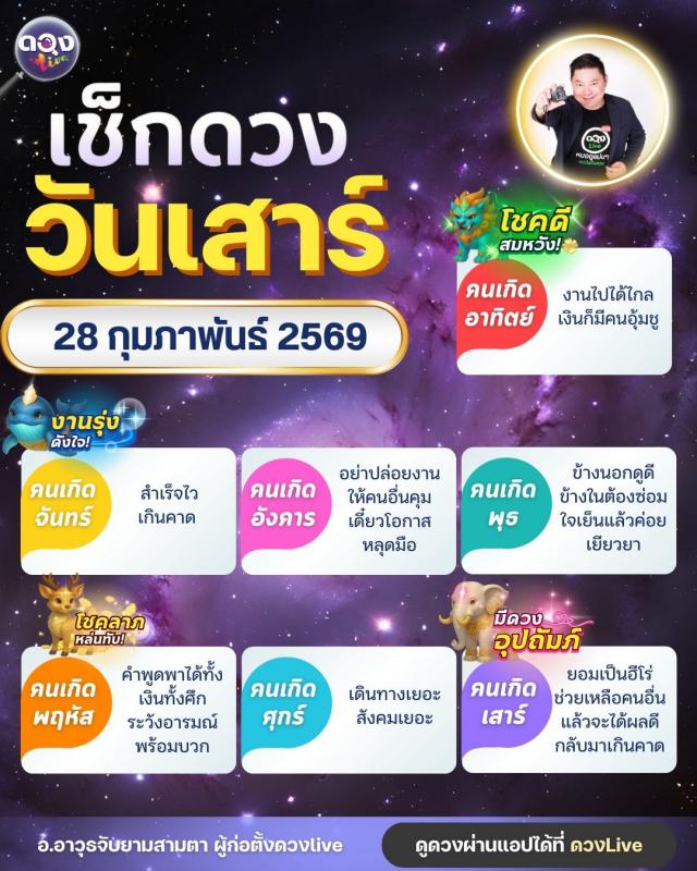 ดวงรายวันประจำวันเสาร์ที่ 28 กุมภาพันธ์ 2569 โดย อ.อาวุธจับยามสามตา – ผู้ก่อตั้งดวง Live
