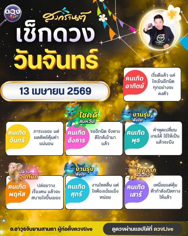 ดวงรายวัน จันทร์ที่ 13 เมษายน 2569 ทำนายโดย อ.อาวุธจับยามสามตา – ผู้ก่อตั้งดวง Live