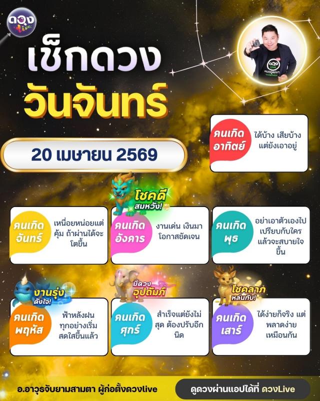 ดวงรายวัน จันทร์ที่ 20 เมษายน 2569ทำนายโดย อ.อาวุธจับยามสามตา – ผู้ก่อตั้งดวง Live