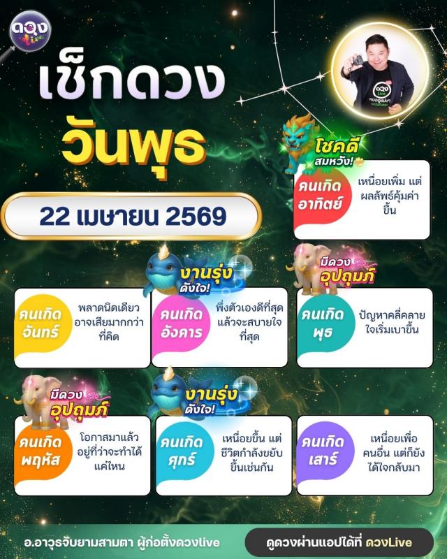 ดวงรายวัน พุธที่ 22 เมษายน 2569ทำนายโดย อ.อาวุธจับยามสามตา – ผู้ก่อตั้งดวง Live