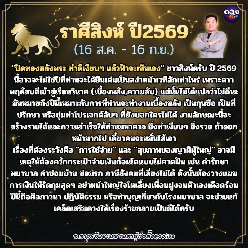 "ปิดทองหลังพระ ทำดีเงียบๆ แล้วฟ้าจะเห็นเอง" ชาวสิงห์ครับ ปี 2569 นี้อาจจะไม่ใช่ปีที่ท่านจะได้ยืนเด่นเป็นสง่าหน้าเวทีสักเท่าไหร่ เพราะดาวพฤหัสบดีเข้าสู่เรือนวินาศ (เบื้องหลัง,ความลับ) แต่นั่นไม่ได้แปลว่าไม่ดีนะ มันหมายถึงปีนี้เหมาะกับการที่ท่านจะทำงานเบื้องหลัง เป็นกุนซือ เป็นที่ปรึกษา หรือซุ่มทำโปรเจกต์ลับๆ ที่ยังบอกใครไม่ได้ งานลักษณะนี้จะสร้างรายได้และความสำเร็จให้ท่านมหาศาล ยิ่งทำเงียบๆ ยิ่งรวย ถ้าออกหน้ามากไป เดี๋ยวคนจะหมั่นไส้เอา