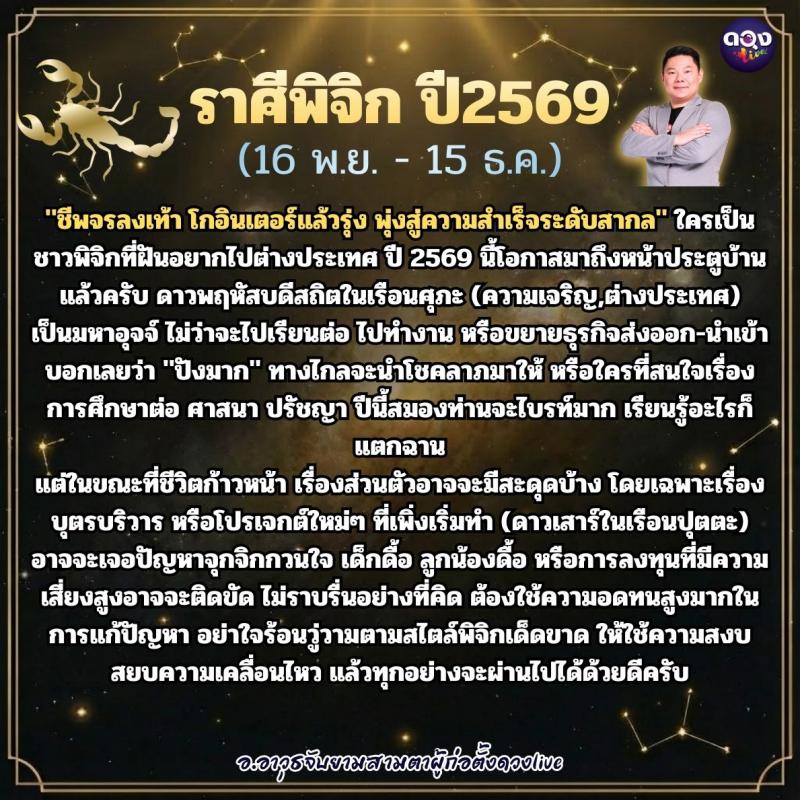 "ชีพจรลงเท้า โกอินเตอร์แล้วรุ่ง พุ่งสู่ความสำเร็จระดับสากล" ใครเป็นชาวพิจิกที่ฝันอยากไปต่างประเทศ ปี 2569 นี้โอกาสมาถึงหน้าประตูบ้านแล้วครับ ดาวพฤหัสบดีสถิตในเรือนศุภะ (ความเจริญ,ต่างประเทศ) เป็นมหาอุจจ์ ไม่ว่าจะไปเรียนต่อ ไปทำงาน หรือขยายธุรกิจส่งออก-นำเข้า บอกเลยว่า "ปังมาก" ทางไกลจะนำโชคลาภมาให้ หรือใครที่สนใจเรื่องการศึกษาต่อ ศาสนา ปรัชญา ปีนี้สมองท่านจะไบรท์มาก เรียนรู้อะไรก็แตกฉาน