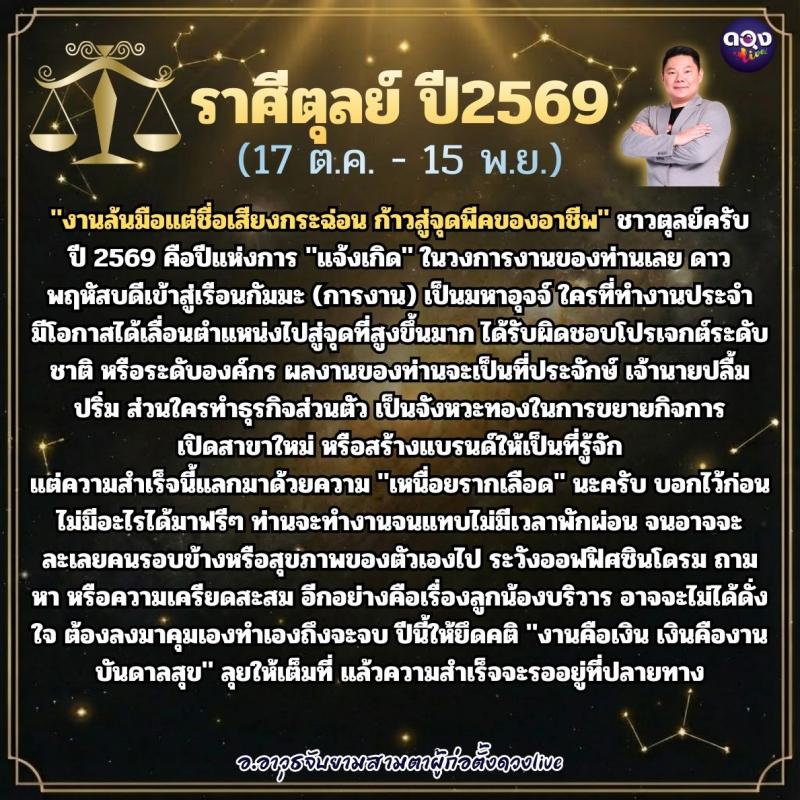"งานล้นมือแต่ชื่อเสียงกระฉ่อน ก้าวสู่จุดพีคของอาชีพ" ชาวตุลย์ครับ ปี 2569 คือปีแห่งการ "แจ้งเกิด" ในวงการงานของท่านเลย ดาวพฤหัสบดีเข้าสู่เรือนกัมมะ (การงาน) เป็นมหาอุจจ์ ใครที่ทำงานประจำ มีโอกาสได้เลื่อนตำแหน่งไปสู่จุดที่สูงขึ้นมาก ได้รับผิดชอบโปรเจกต์ระดับชาติ หรือระดับองค์กร ผลงานของท่านจะเป็นที่ประจักษ์ เจ้านายปลื้มปริ่ม ส่วนใครทำธุรกิจส่วนตัว เป็นจังหวะทองในการขยายกิจการ เปิดสาขาใหม่ หรือสร้างแบรนด์ให้เป็นที่รู้จัก