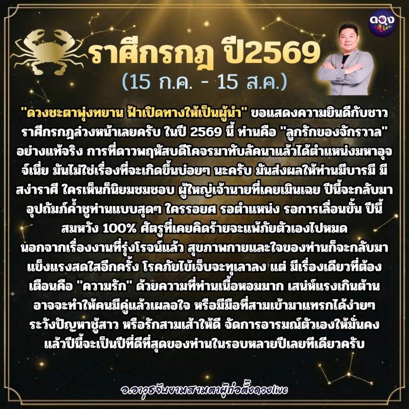 "ดวงชะตาพุ่งทยาน ฟ้าเปิดทางให้เป็นผู้นำ" ขอแสดงความยินดีกับชาวราศีกรกฎล่วงหน้าเลยครับ ในปี 2569 นี้ ท่านคือ "ลูกรักของจักรวาล" อย่างแท้จริง การที่ดาวพฤหัสบดีโคจรมาทับลัคนาแล้วได้ตำแหน่งมหาอุจจ์เนี่ย มันไม่ใช่เรื่องที่จะเกิดขึ้นบ่อยๆ นะครับ มันส่งผลให้ท่านมีบารมี มีสง่าราศี ใครเห็นก็นิยมชมชอบ ผู้ใหญ่เจ้านายที่เคยเมินเฉย ปีนี้จะกลับมาอุปถัมภ์ค้ำชูท่านแบบสุดๆ ใครรอยศ รอตำแหน่ง รอการเลื่อนขั้น ปีนี้สมหวัง 100% ศัตรูที่เคยคิดร้ายจะแพ้ภัยตัวเองไปหมด