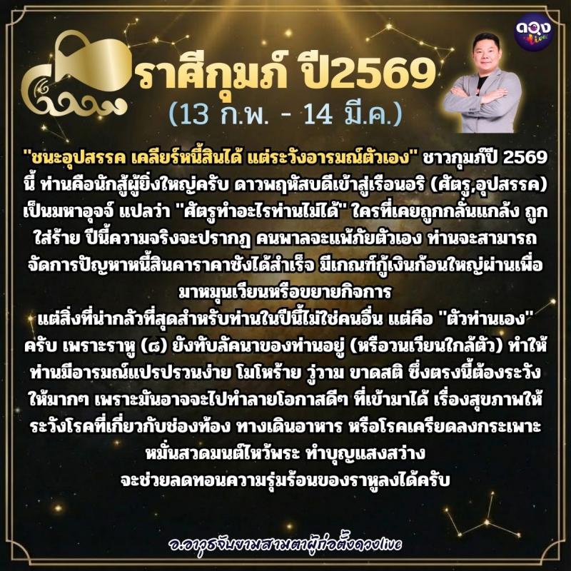 "ชนะอุปสรรค เคลียร์หนี้สินได้ แต่ระวังอารมณ์ตัวเอง" ชาวกุมภ์ปี 2569 นี้ ท่านคือนักสู้ผู้ยิ่งใหญ่ครับ ดาวพฤหัสบดีเข้าสู่เรือนอริ (ศัตรู,อุปสรรค) เป็นมหาอุจจ์ แปลว่า "ศัตรูทำอะไรท่านไม่ได้" ใครที่เคยถูกกลั่นแกล้ง ถูกใส่ร้าย ปีนี้ความจริงจะปรากฏ คนพาลจะแพ้ภัยตัวเอง ท่านจะสามารถจัดการปัญหาหนี้สินคาราคาซังได้สำเร็จ มีเกณฑ์กู้เงินก้อนใหญ่ผ่านเพื่อมาหมุนเวียนหรือขยายกิจการ