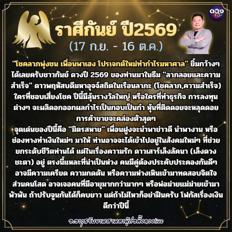 "โชคลาภพุ่งชน เพื่อนพาเฮง โปรเจกต์ใหม่ทำกำไรมหาศาล" ยิ้มกว้างๆ ได้เลยครับชาวกันย์ ดวงปี 2569 ของท่านมาในธีม "ลาภลอยและความสำเร็จ" ดาวพฤหัสบดีมหาอุจจ์สถิตในเรือนลาภะ (โชคลาภ,ความสำเร็จ) ใครที่ชอบเสี่ยงโชค ปีนี้มีลุ้นรางวัลใหญ่ หรือใครที่ทำธุรกิจ การลงทุนต่างๆ จะผลิดอกออกผลกำไรเป็นกอบเป็นกำ หุ้นที่ติดดอยจะหลุดดอย การค้าขายจะคล่องตัวสุดๆ