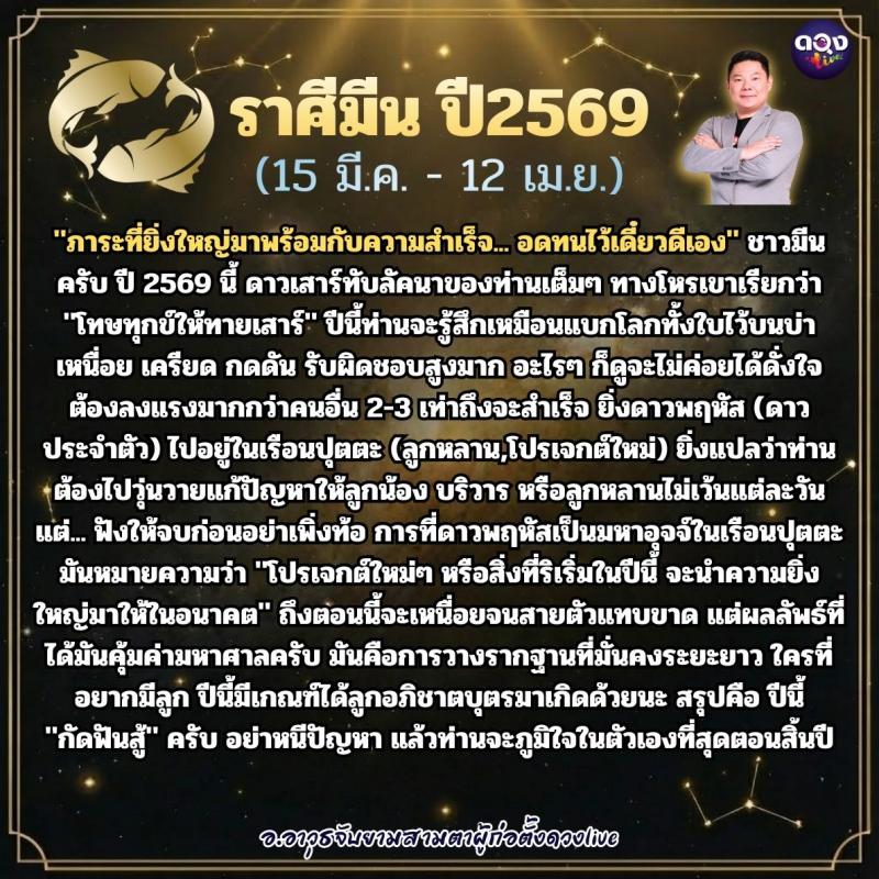 "ภาระที่ยิ่งใหญ่มาพร้อมกับความสำเร็จ... อดทนไว้เดี๋ยวดีเอง" ชาวมีนครับ ปี 2569 นี้ ดาวเสาร์ทับลัคนาของท่านเต็มๆ ทางโหรเขาเรียกว่า "โทษทุกข์ให้ทายเสาร์" ปีนี้ท่านจะรู้สึกเหมือนแบกโลกทั้งใบไว้บนบ่า เหนื่อย เครียด กดดัน รับผิดชอบสูงมาก อะไรๆ ก็ดูจะไม่ค่อยได้ดั่งใจ ต้องลงแรงมากกว่าคนอื่น 2-3 เท่าถึงจะสำเร็จ ยิ่งดาวพฤหัส (ดาวประจำตัว) ไปอยู่ในเรือนปุตตะ (ลูกหลาน,โปรเจกต์ใหม่) ยิ่งแปลว่าท่านต้องไปวุ่นวายแก้ปัญหาให้ลูกน้อง บริวาร หรือลูกหลานไม่เว้นแต่ละวัน
