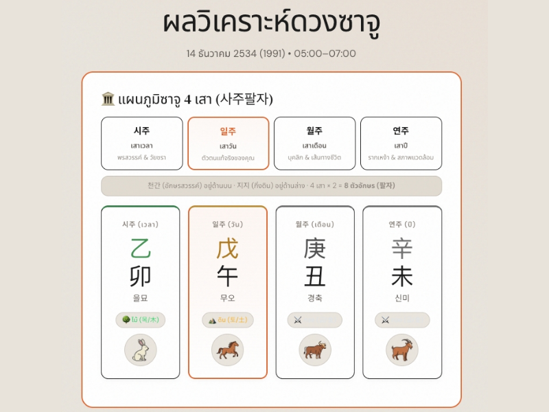 อ่านนิสัยลึกถึงแก่น: ซาจูไม่ได้บอกแค่ดวงดีหรือร้าย แต่บอกว่า "ตัวตนที่แท้จริง" ของคุณเป็นธาตุอะไร (เช่น เป็นคนธาตุไฟที่ใจร้อน หรือธาตุน้ำที่ปรับตัวเก่ง) ช่วยให้เข้าใจตัวเองมากขึ้น