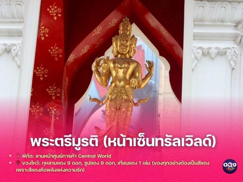 ถึงแม้จะมีกระแสถกเถียงเรื่ององค์จริงองค์แทน แต่ปฏิเสธไม่ได้เลยว่าลานหน้าเซ็นทรัลเวิลด์คือจุดเช็คอินอันดับต้นๆ ๆงคนโสดทั่วสารทิศ โดยเฉพาะคืนวันพฤหัสบดี ที่นี่จะเต็มไปด้วยคนโสดชุดแดง! เชื่อกันว่าเทพเจ้าแห่งความรักจะเสด็จลงมาฟังคำขอพรในช่วงเวลานั้น ใครที่อยากเจอรักแท้ หรืออยากให้คนรักกลับมา ต้องมาที่นี่ค่ะ